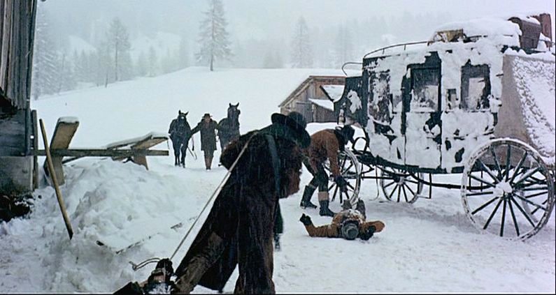 Gibt es in „Django“ , wenn schon keine Erlösung, wenigstens die Vollendung der Rache, bleibt dies der Hauptfigur des zweiten Kultfilms, „Il Grande Silenzio“ (in der deutschen Version ‚Silence‘ genannt) versagt. Der hierzulande mit dem schmissigen Titel versehene „Leichen pflastern seinen Weg“ ist Sergio Corbuccis eindrücklichstes, trotz „Django“ und „Il Mercenario“, durchdachtestes und bemerkenswertestes Werk. Die finstere Essenz des Italo-Westerns (neben Giulio Questis genialem „Töte Django“), gerade weil er mit dessen Regeln bricht beziehunggsweise auf geschickte Weise mit ihnen spielt. Statt in flirrender Wüstenhitze (oder im Schlammbad) spielt der Film in der schneebedeckten Landschaft Utahs (zu finden in Südtirol, den Abruzzen und Cortina) und zeigt seine Probanden dort als dunkle (mal schwarze, mal blutrote) Fremdkörper, eingefroren und hoffnungslos verloren. Waren die Protagonisten früherer Western schweigsam, so lässt Corbucci seine Hauptfigur, perfekt zwischen verlorener Unschuld und Gnadenlosigkeit verkörpert von Jean Louis-Trintignant, komplett verstummen. Anekdotisch geschuldet der Tatsache, dass Trintignant zur Zeit der Dreharbeiten kein Englisch konnte, aber natürlich Teil eines ausgefeilten Konzepts.