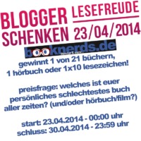 „Blogger schenken Lesefreude“ ist eine Gemeinschaftsaktion lesebegeisterter Blogger, die zum Welttag des Buches auf ihren Blogs Lieblings-Bücher verlosen. Initiiert wurde das Ganze von Dagmar Eckhardt (GeschichtenAgentin, Buchkind-Blog) und Christina Mettge (Pudelmützes Bücherwelten). 2013 nahmen über 1000 Blogger an dieser Aktion teil.