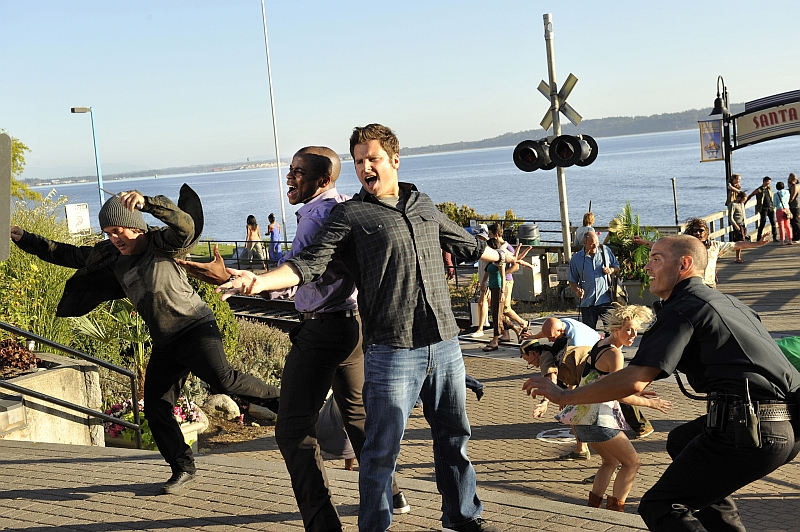 Der Einsatz des kompletten Teams ist besonders im abschließenden Zweiteiler „psych – The Musical“, im Deutschen etwas unschön „psych macht Musik: Weltstars singen woanders“ betitelt – gefragt. Die Besonderheit dieser Doppelfolge, in welcher Jagd auf den unbekannten Mörder „Z.“ gemacht wird, ist, dass sie von zahlreichen Musicalsequenzen lebt. Hierbei beweisen sämtliche Hauptdarsteller nicht nur darstellerisches, sondern überraschend viel gesangliches Talent. Ganz gleich, ob Dulé Hill und James Roday (Gus & Shawn) oder Maggie Lawson (Jules), Timothy Omundson (Lassiter), Kurt Fuller (Pathologe Woody) oder Kirsten Nelson (Chief Vick), sie alle lassen den Zuschauer und -hörer staunen. So weit, so gut. Die Idee ist äußerst mutig, und jener Mut sollte klar anerkannt werden, doch manchmal erscheint die Handlung selbst für „psych“-Verhältnisse ein wenig an den Haaren herbeigezogen und in eine spielfilmlange Handlung gezwängt. Da die Musical-Intermezzi immer wieder von ’normalen‘ Szenen umgeben sind, steht die Musical-Komponente manchmal etwas nackt da – etwas mehr Theatralik hätte hier durchaus gut getan. Wenn schon dick auftragen, dann bitte richtig.