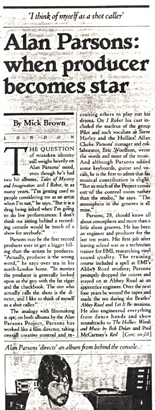 Aus den verrauchten Kontrollräumen ins Rampenlicht aufzusteigen, war für einen reinen Tontechniker eine ungewöhnliche Karriere. Zumal die sound engineers Leute waren, die damals noch häufig ein weißes Hemd und eine Krawatte trugen und meistens Kette geraucht haben. Parsons bat deshalb Woolfson, ihn als Manager zu vertreten. Ein Tontechniker mit eigenem Manager war für damalige Verhältnisse geradezu unerhört.
