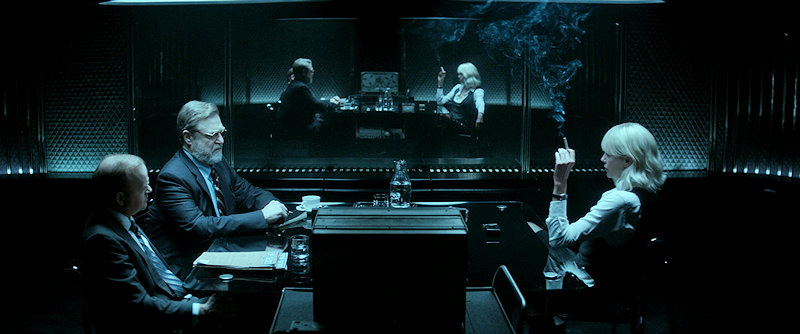 Um von der Abwesenheit einer komplexen Story abzulenken werden Rückblenden bemüht. Lorraine Broughton sitzt mit ihrem MI6 Vorgesetzten Eric Gray (siehe auch „Sixty Spyshades Of Gray“) und dem CIA-Agenten Emmett Kurzfeld in einem Verhörraum und erzählt von ihren actionreichen Abenteuern im Moloch Berlin. Hinter dem obligatorischen Einwegspiegel steht der ominöse Chief „C“ und beurteilt die unbefriedigende Gesamtsituation. Falls die Frage aufkommt, ob sich die angeschlagene Blondine heil aus der Affäre, die einige belastende Momente gegen sie aufweist, ziehen kann: Fragt nicht. Ihr habt schon Filme gesehen.