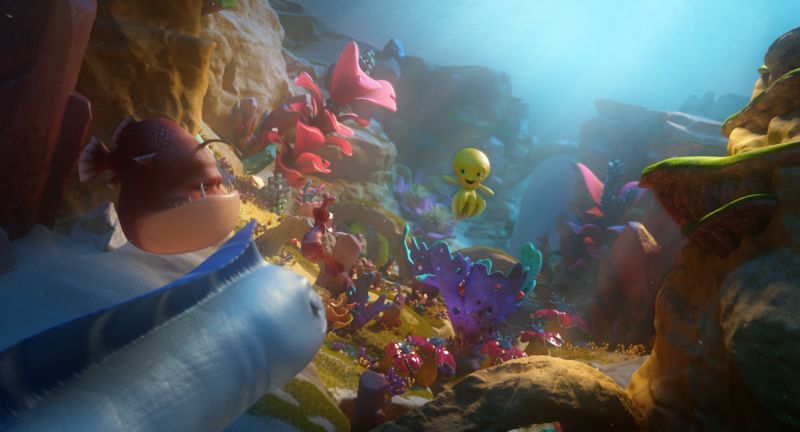 Die Umweltkatastrophen verkommen in „Deep“ aber größtenteils zur Kulisse, die überdies noch nicht mal überzeugend mit Leben gefüllt wird. Es ist eine Reise durch einen Themenpark, der aber kaum zeigt, dass die Fauna der Weltmeere fundamental gefährdet ist. Dass kaum etwas über die beteiligten Tiere vermittelt wird (Anglerfische außerhalb der Tiefsee?), dürfte da leider kaum überraschen. Stattdessen ist der Film für eine Altersfreigabe von 0 Jahren unverhältnismäßig düster, eklig und gruselig. Deformiertes und bösartiges Meeresgetier säumt den Weg, es wird gerülpst, gepinkelt und „geboren“. Das ist meist lustig gemeint, doch weder können junge Menschen dies verstehen, noch sind die Gags mit Pointen hinterlegt worden. Das macht „Deep“ zu einer peinlichen Angelegenheit, weil kaum ein Witz sitzt, geschweige denn funktioniert. Häufig ist er völlig fehl am Platz und zudem auch noch unlogisch, wenn es beispielsweise um die Lava geht, die eigentlich tödlich ist, aber als Gag über die Babyfische geschüttet wird, die danach verkohlt und bedröppelt in die Kamera schauen. Oder wenn Deep die Aquarien in New York „cool“ findet.