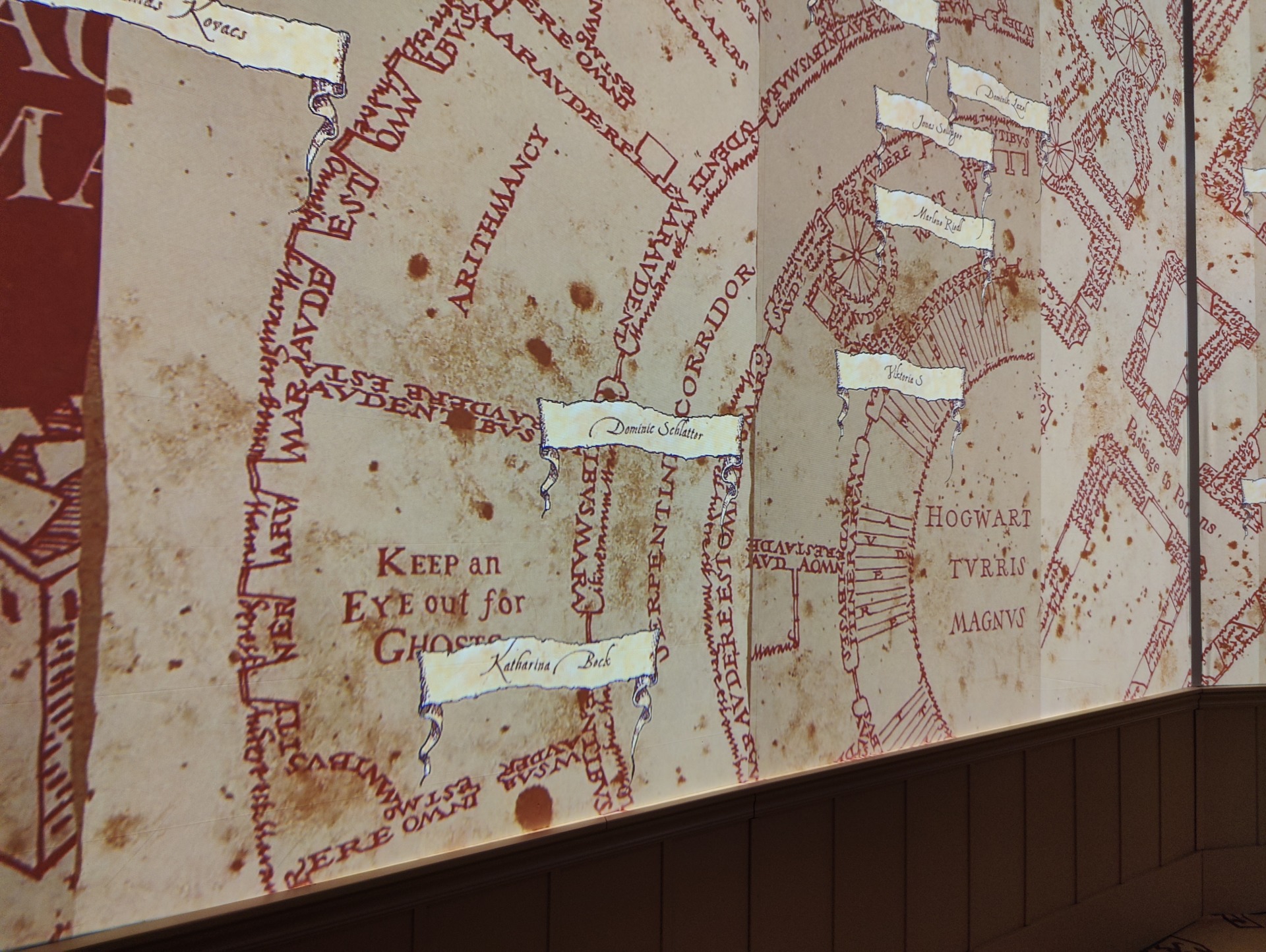 Der erste Raum ist eine riesige Karte des Rumtreibers, wo der eigene Name erscheint. Mittels Screens und Projektionen machen wir uns also auf die Reise nach Hogwarts. Über die Portraitgalerie gelangen wir in einen weiteren Raum, mit mehreren Abzweigungen. Dort werden jeweils die vier verschiedenen Häuser Hogwarts vorgestellt, samt bekannte Schüler*innen. Ausgestellt werden hauptsächlich Original-Kostüme mit Begleittexten der Designer. Für echte Fans gibt es kaum neue Infos, schön ist allerdings, dass auch das Theaterstück “Harry Potter und das verwunschene Kind” sowie die “Fantastische Tierwesen”-Reihe berücksichtigt wurden.