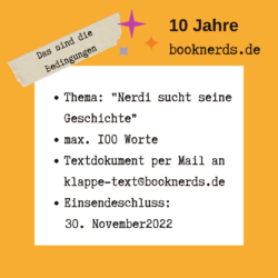 Anlässlich unseres Jubiläums „10 Jahre Booknerds.de“ schrieben wir Ende letzten Jahres im Rahmen der Kolumne „Klappe, Text!“ unseren ersten Literaturwettbewerb aus! (Mehr dazu hier.) Wir waren auf der Suche nach euren Ideen zum Thema „Nerdi sucht seine Geschichte“ – und das in mehr als knapper Form: Mehr als 100 Zeichen sollten die Beiträge nicht überschreiten. Eine Hürde, an der einige Einsendungen leider scheiterten. Natürlich fühlten wir uns geehrt, dass eure Kreativität keine Grenzen kennt, unsere Ausschreibung aber schon. Schließlich mussten wir fair bleiben, auch wenn wir das ein oder andere Auge zugedrückt haben. Aber ja, ihr kennt das Sprüchlein: In der Kürze liegt die Würze. Und das war eben eine der Herausforderungen, die zehn von euch mit Bravour gemeistert haben!